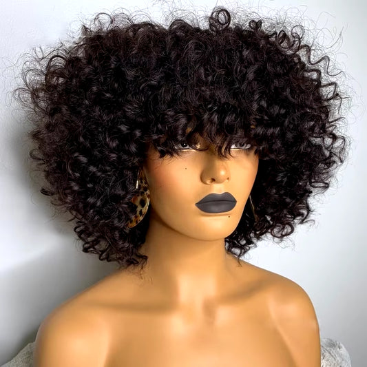 Brown Color Brazilian Remy Curly Hair Wig with Bangs 180% Density Deep Wave Glueless Human Hair Wigs for Black Women No Lace Wig